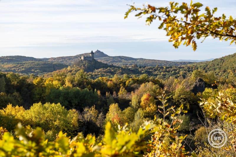 Fotó: A somoskői vár (bal) és Salgó vára látszik a felvidéki Sátorosbánya közelében lévő macskalyuki kőbányából 2024. október 24-én. MTI/Komka Péter