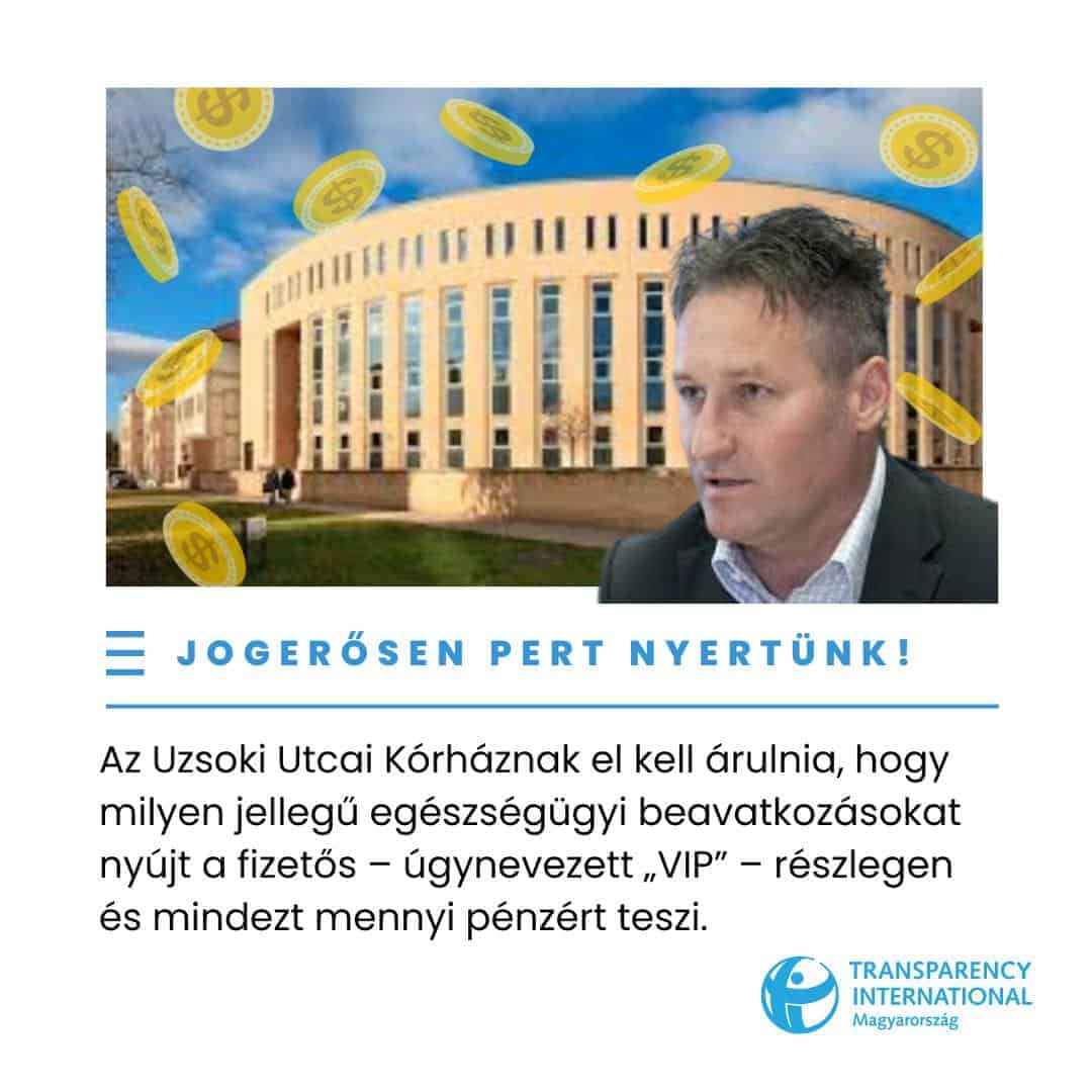 Jogerősen pert nyert a Transparency International Magyarország az Uzsoki Utcai Kórházzal szemben. A civil szervezet azt követelte, hogy a kórház hozza nyilvánosságra, milyen típusú egészségügyi beavatkozásokat nyújt a VIP-részlegen, és milyen összegeket kér ezekért. A per előzménye egy Hadházy Ákos által benyújtott adatigénylés volt, amelyet a kórház megtagadott.