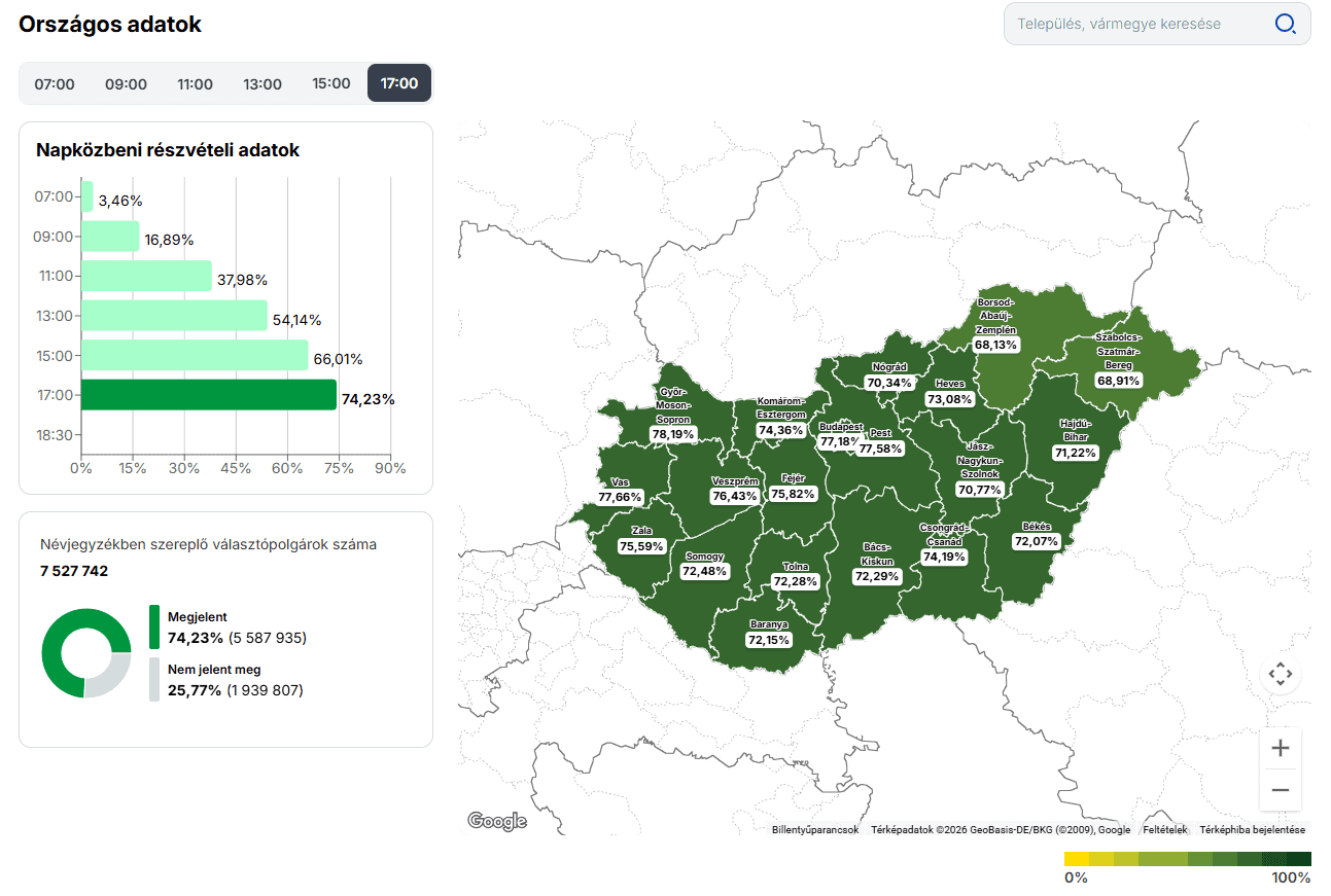 A vármegyei adatok szintén azt mutatják, hogy országos jelenségről van szó, nem csupán egyes régiók kiugró teljesítményéről. A 17 órás adatok alapján több vármegyében is 70 százalék körüli vagy azt meghaladó részvételt mértek.
